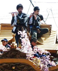 男の子達が太鼓や笛を鳴らし民家の