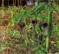 苗の中の太い肉状の花軸に、小さな花が密生するが、このような花の集まりを肉穂花序といい、サトイモ科の特徴である。