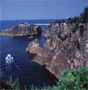 【尖閣湾】達者から揚島までの約2kmの海岸線。紺碧の海に屹立する荒削りの断崖と波涛に洗われる珊瑚のダイナミックな自然の造形美は、佐渡を代表する景観の一つ。大崎灯台へかかる遊仙橋は、映画「君の名は」の舞台にもなり、別名「真知子橋」の名がある。