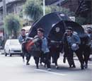 大神宮の大祭で、どこが尾なのかわからないほどの大きな「たかみ獅子」(佐渡で前足・後足の二人組で舞う形から発展した40人も入って練り歩く巨大獅子で約8mもある)が町内を練り歩く。